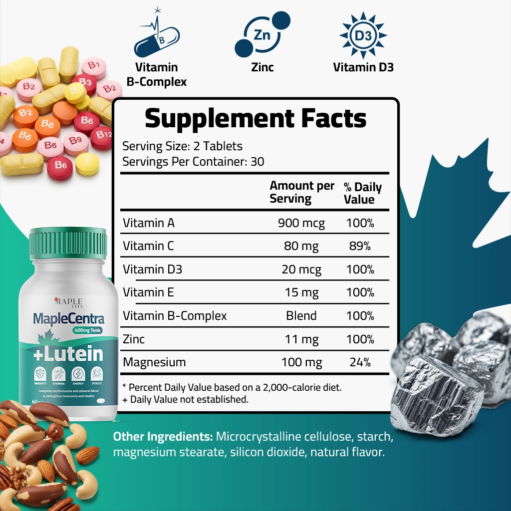 “تعزيز القوة والقدرة والمناعة.” مابل سنترا تونيك يجمع بين فيتامينات ومعادن أساسية لدعم عملية التمثيل الغذائي للطاقة، وتقوية صحة العضلات والعظام، وتعزيز المناعة. هذه التركيبة المتوازنة بعناية مثالية للرجال والرياضيين وكبار السن الذين يسعون لتحسين التركيز والتحمّل والحيوية العامة.