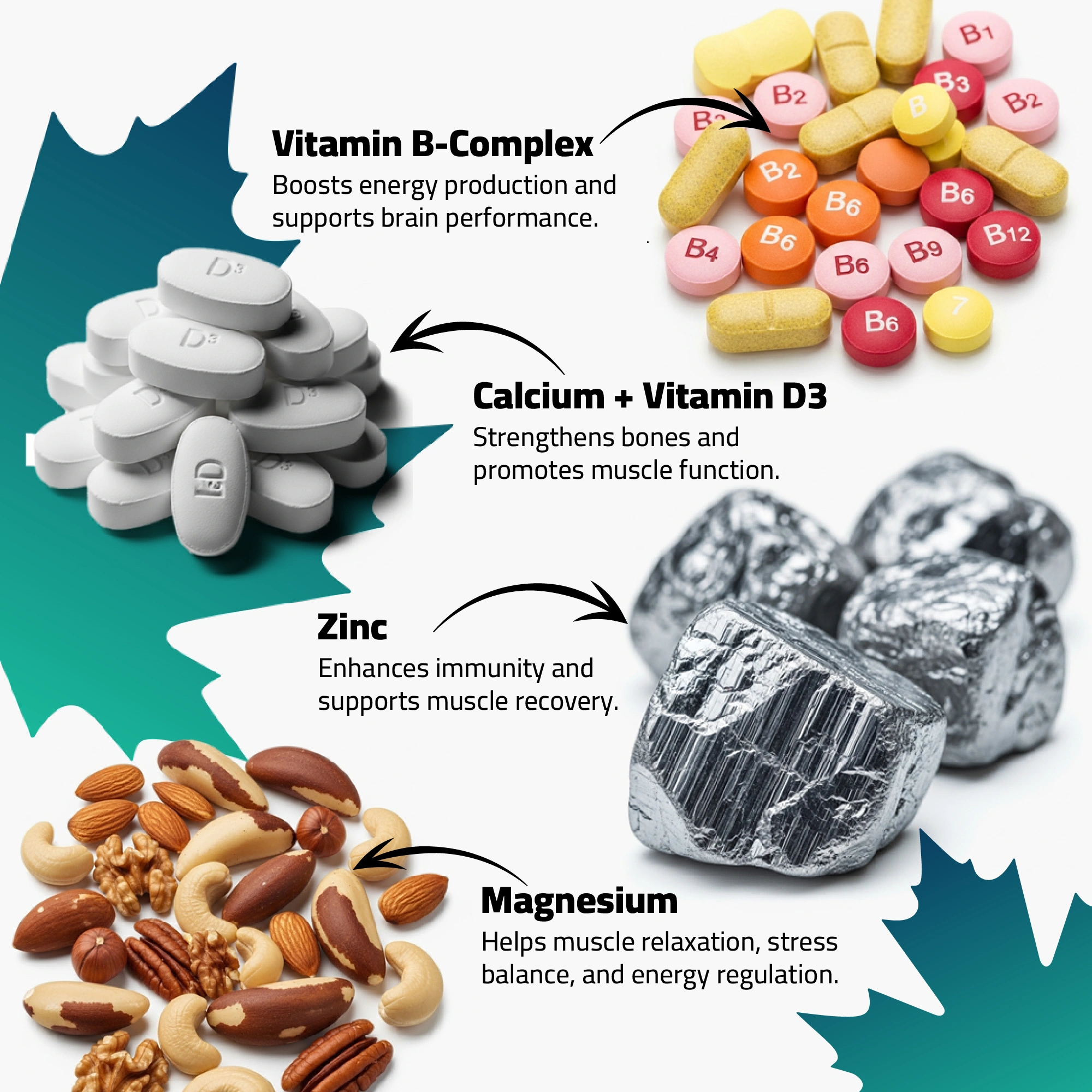 - مجموعة فيتامين B: تعزز عملية إنتاج الطاقة وتقلل الإرهاق لدى الرجال والرياضيين.
