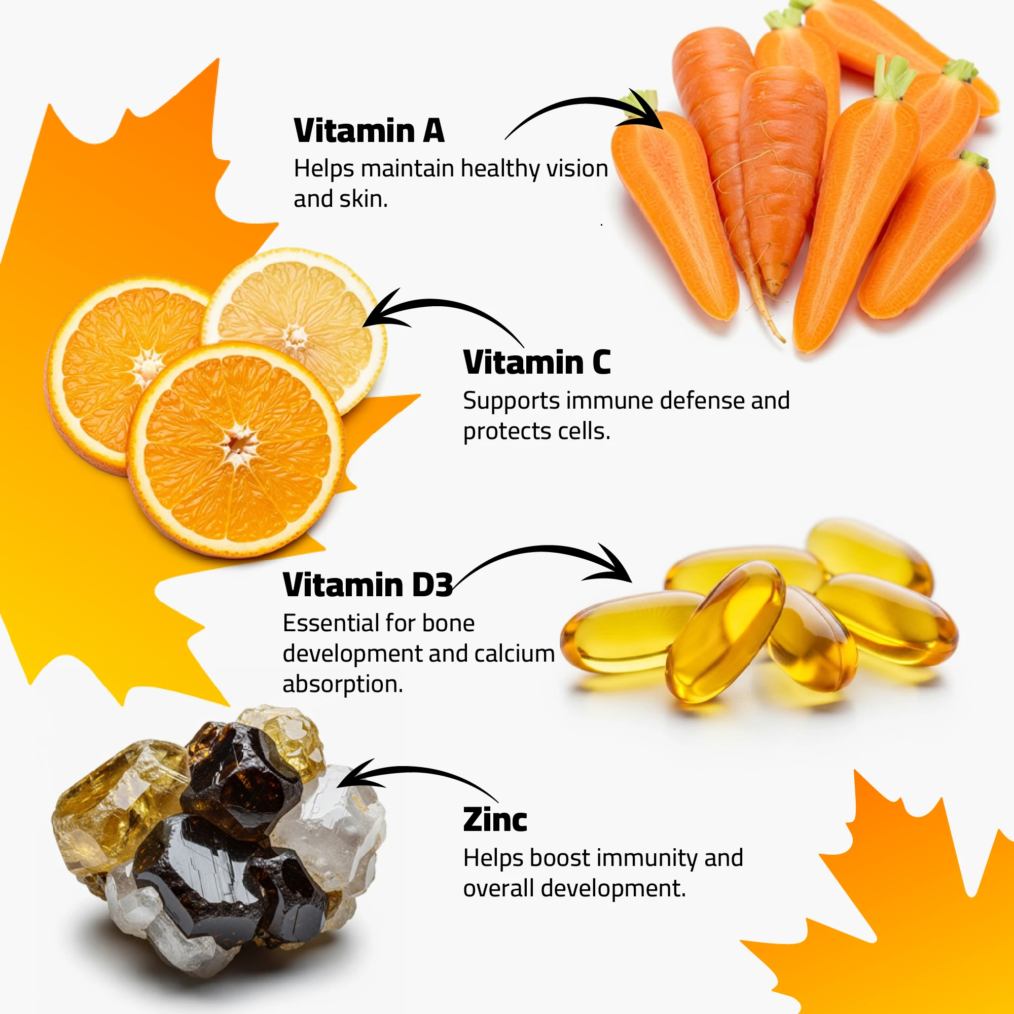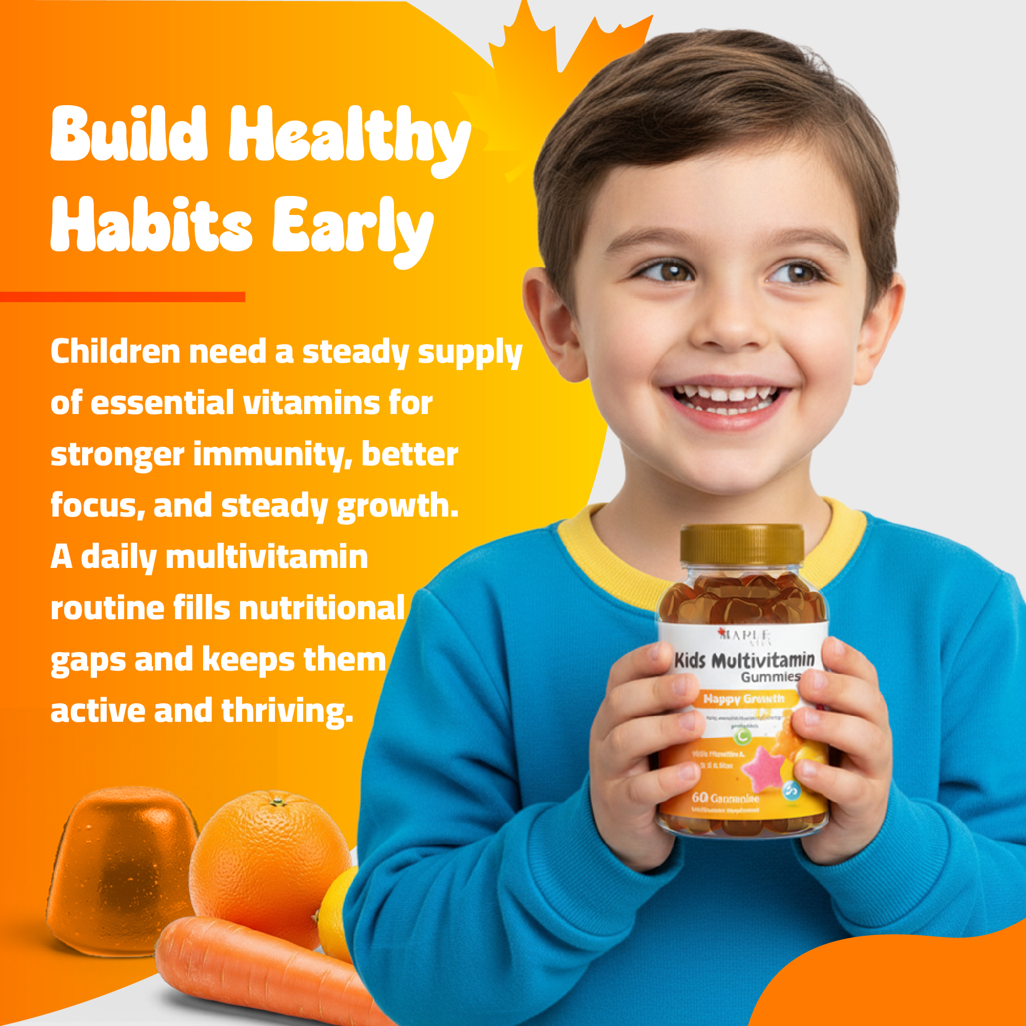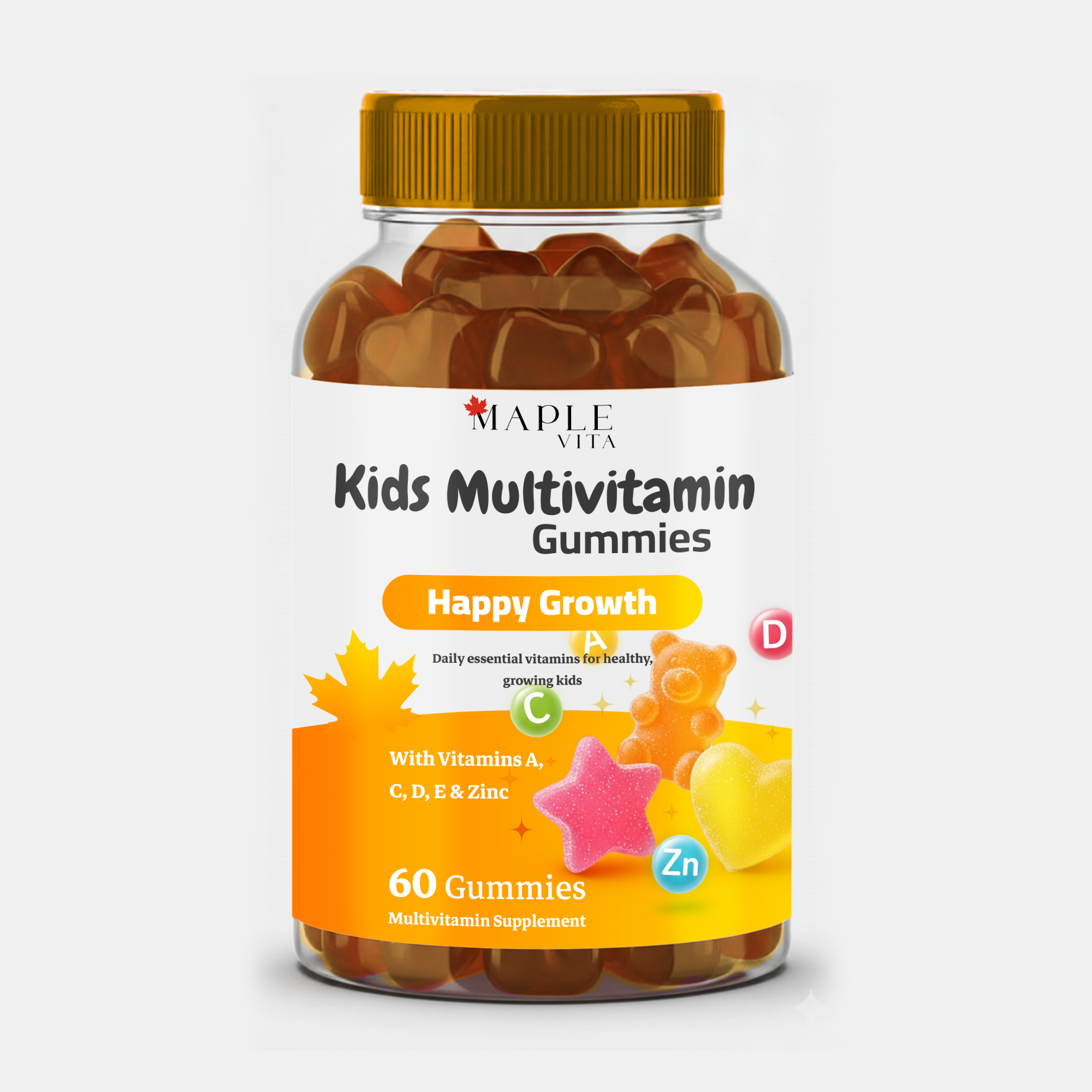 MapleVita Kids Multivitamin Gummies are specially formulated for children’s daily nutrition needs. Enriched with Vitamins A, C, D, E, and Zinc, they help support strong immunity, growth, and cognitive development in a fun, fruity gummy form.