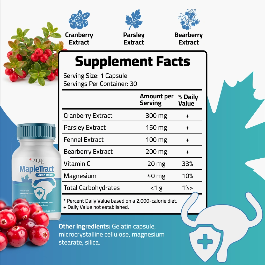 MapleTract Clean Relief is a specialized herbal formula designed to enhance kidney filtration, promote detoxification, and maintain urinary tract comfort. Powered by natural extracts like Cranberry, Bearberry, Parsley, and Fennel, it provides effective urinary cleansing and supports men’s overall renal wellness.