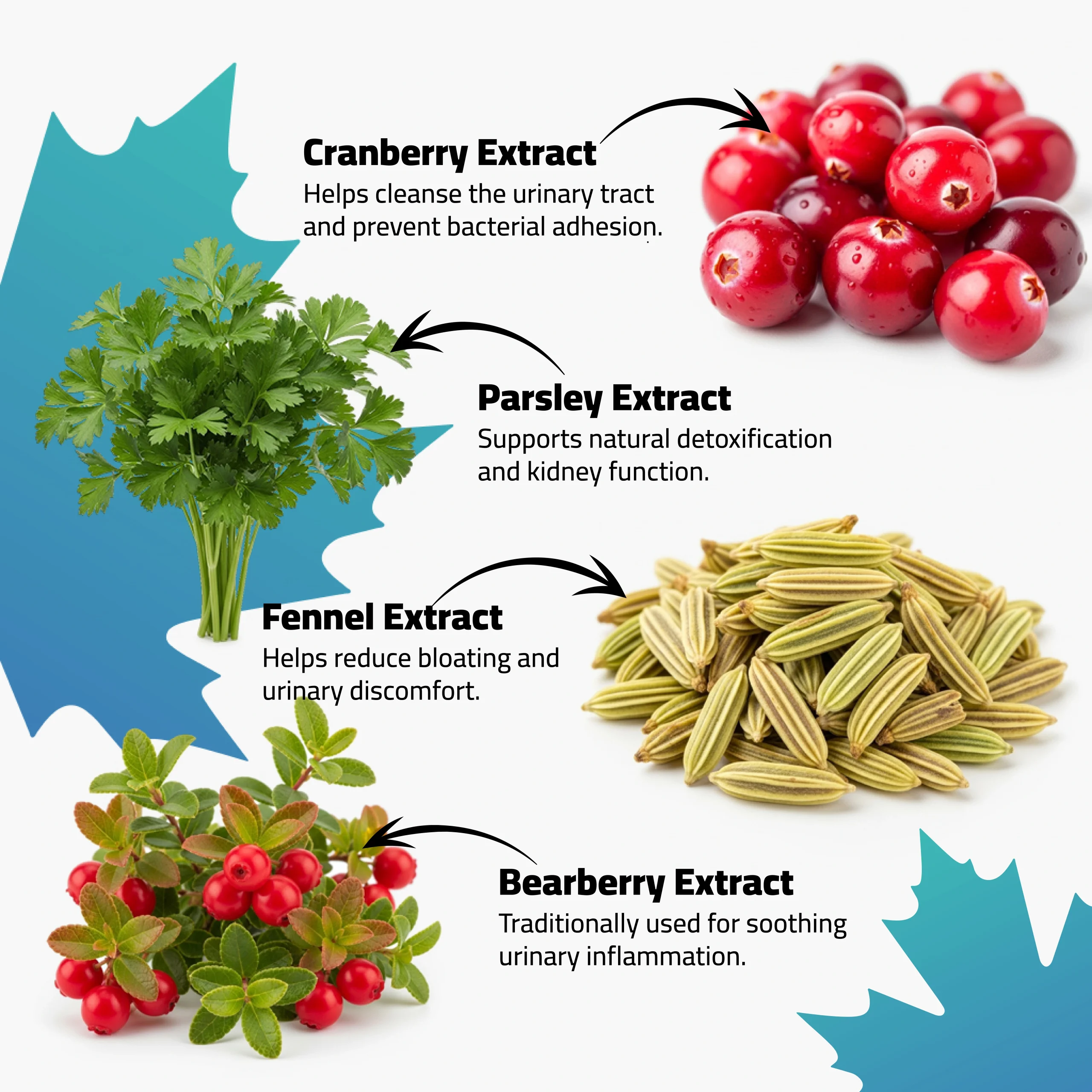 - Active Ingredients: Cranberry extract, Parsley extract, Fennel extract, Bearberry extract