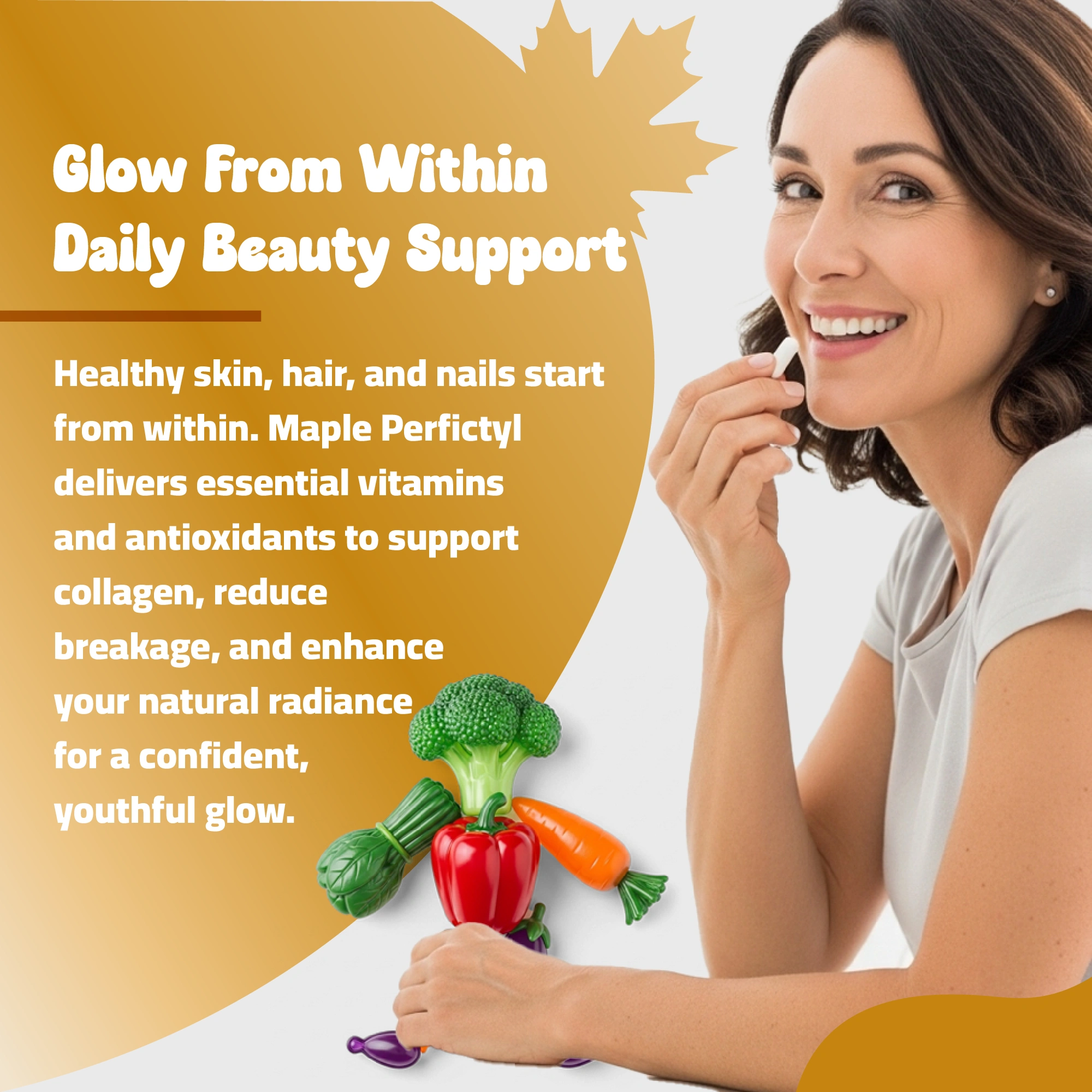 Maple Perfictyl combines a powerful blend of vitamins, minerals, and antioxidants to revitalize your natural beauty from within. Designed especially for women, it supports collagen synthesis, strengthens hair and nails, and enhances skin luminosity while protecting cells from oxidative stress for a youthful, healthy glow.