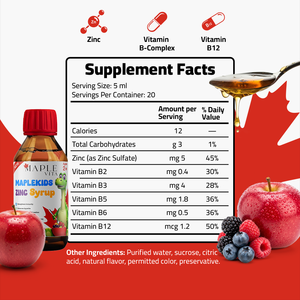 MapleKids Zinc Syrup is a complete wellness formula designed to promote your child’s healthy growth and strong immune defense. Enriched with Zinc and vital B-complex vitamins, it improves digestion, boosts appetite, and enhances bone and brain development—making it an ideal daily companion for growing kids.