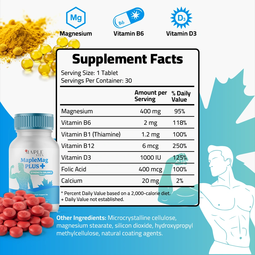 MapleMag Plus combines the power of Magnesium with essential B vitamins and Vitamin D3 to support muscle function, energy production, and overall vitality. It’s expertly formulated for men, athletes, diabetics, and older adults who need balanced performance, strength, and recovery support — all in one daily tablet.