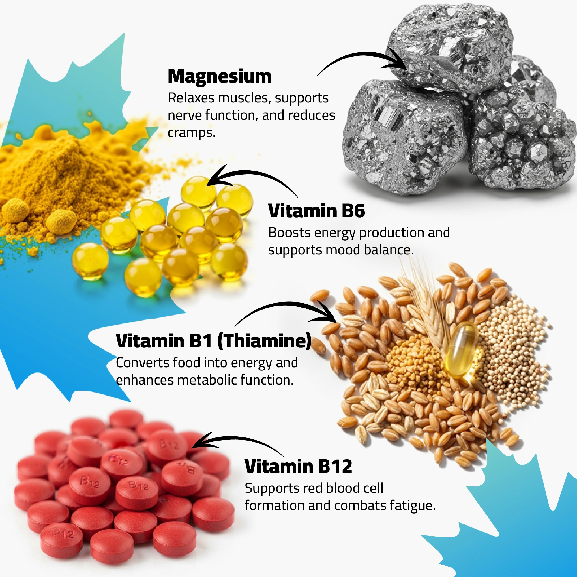 - Active Ingredients: Magnesium (400 mg), Vitamin B6, Vitamin B1 (Thiamine), Vitamin B12, Vitamin D3 (1000 IU), Folic Acid