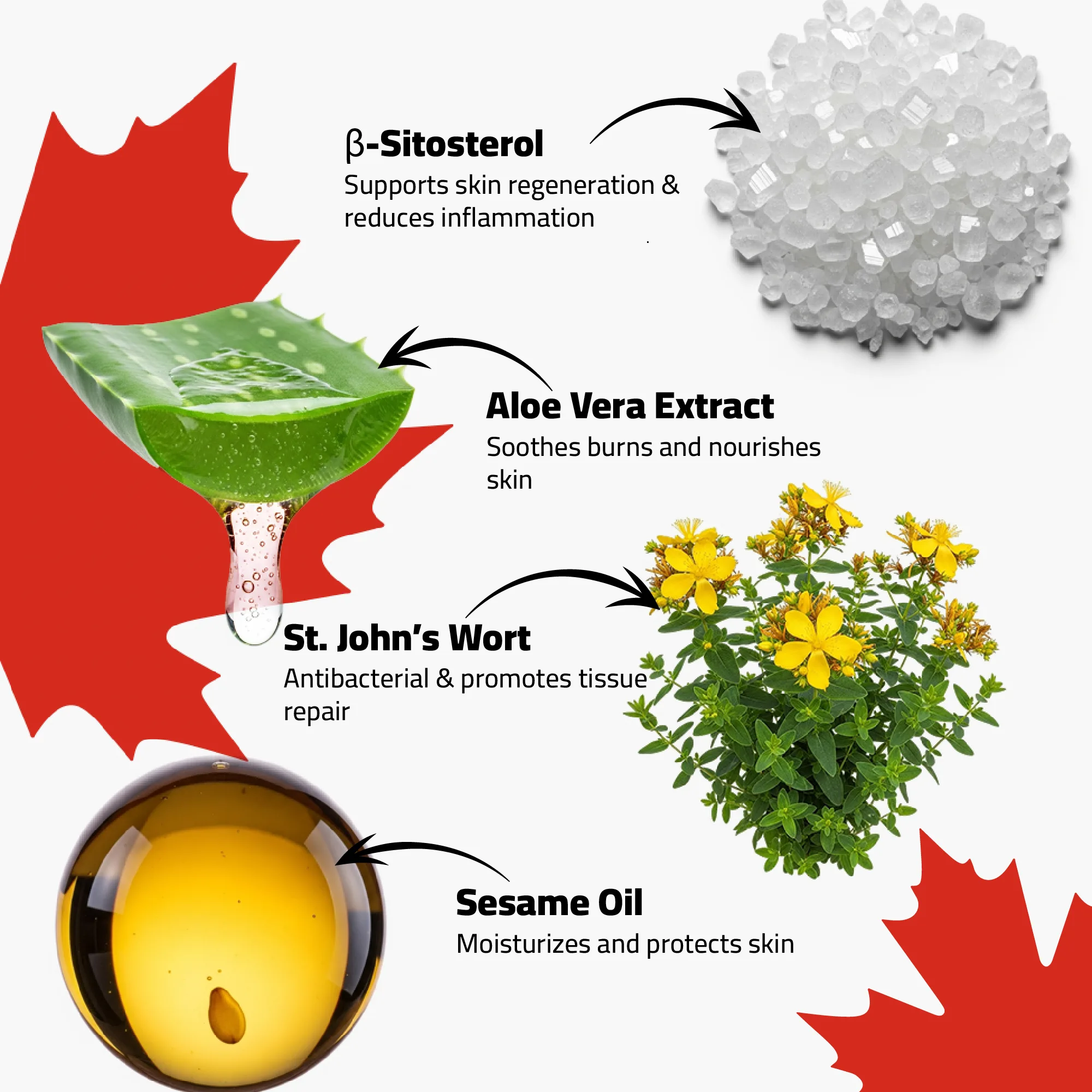 - Active Ingredients: β-Sitosterol (0.25%), Aloe Vera Extract, Hypericum perforatum (St. John’s Wort), Sesame Oil, Beeswax