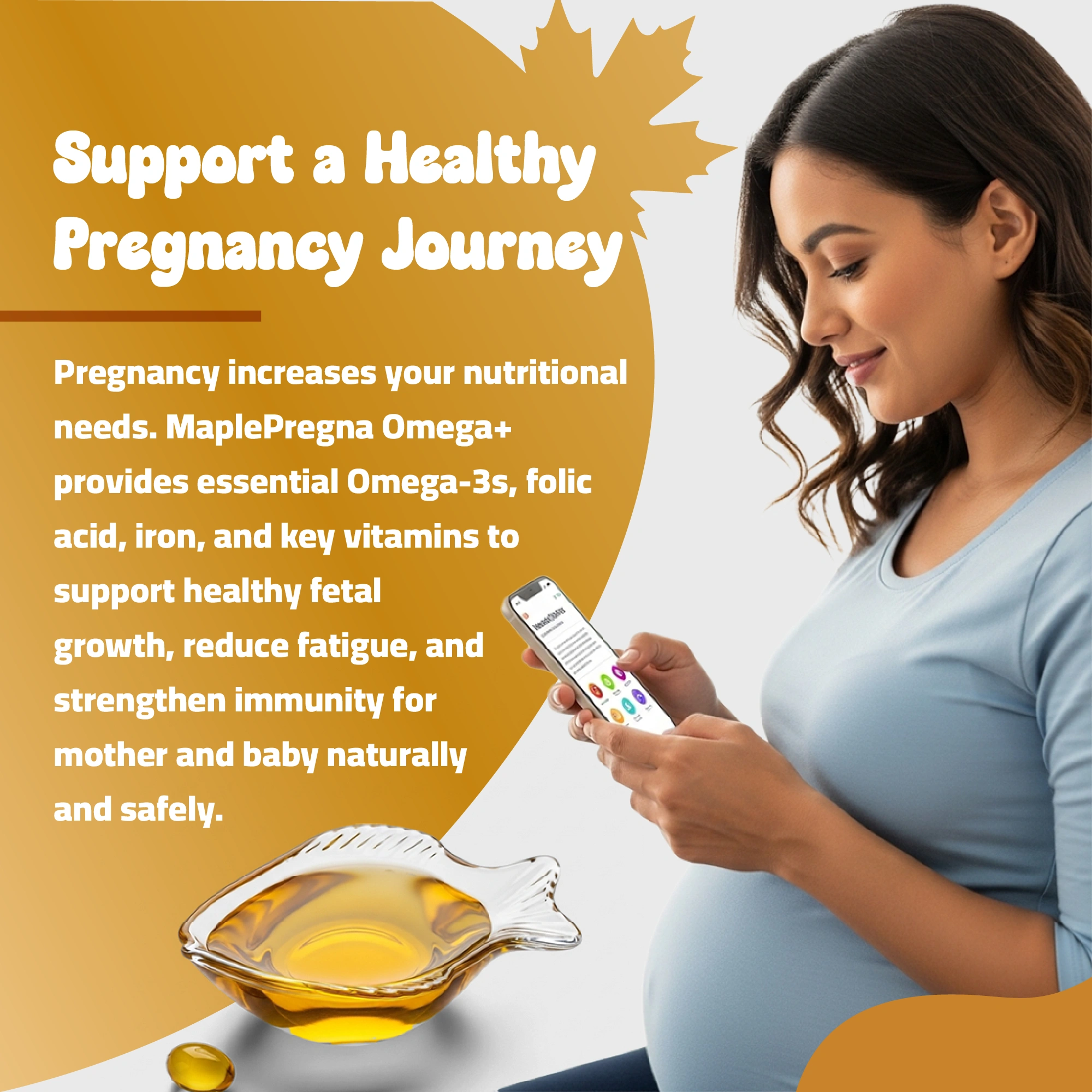 MaplePregna Omega+ is a scientifically balanced prenatal formula designed to meet the unique nutritional needs of expectant mothers and their developing babies. Enriched with Omega-3 fatty acids, essential vitamins, and minerals, it supports brain, bone, and immune development while enhancing maternal vitality throughout all trimesters.