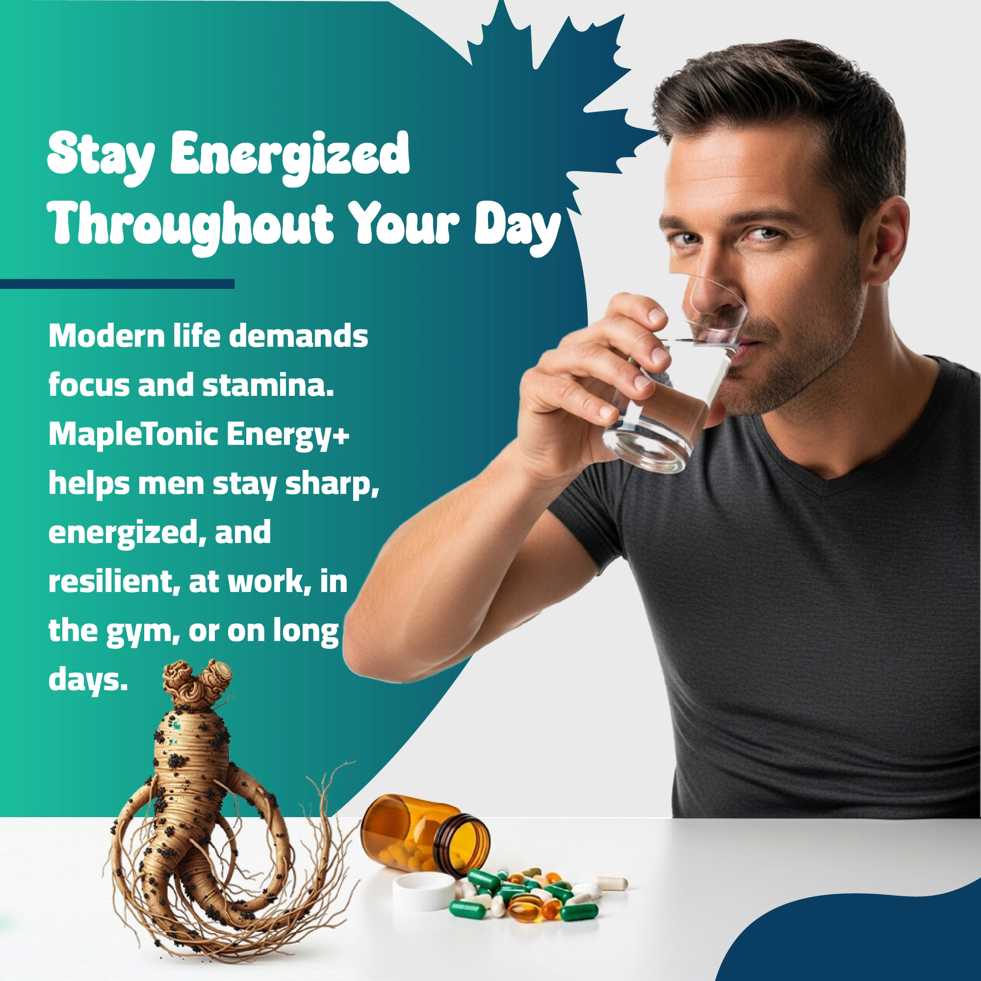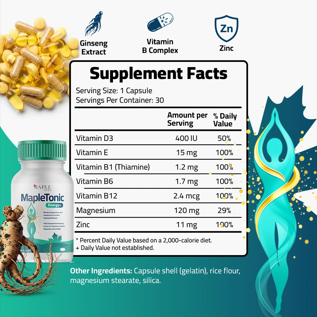 MapleTonic Energy+ is specially formulated for adult men seeking enhanced stamina, energy, and mental performance. Combining essential vitamins, minerals, and herbal extracts, this daily supplement helps reinforce body defenses, improve focus, and support overall physical and mental well-being.